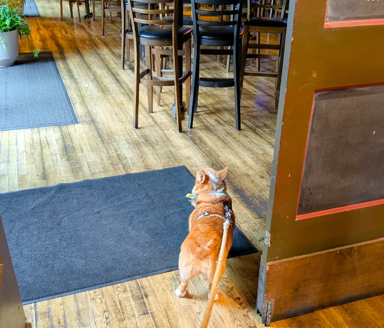 This was a fantastic visit for both us and Ein. When we first arrived at the restaurant, the waitstaff were extremely excited to see a corgi, but we were also well-prepared. When they brought water for the humans to the table, they also provided a water bowl for Ein. This was something we never expected, as the place has real wood floors, and we can't imagine how difficult it must be to maintain them if water is constantly spilling. When we first arrived, Ein was the only dog in the restaurant, but about halfway through the meal, another family showed up with a larger breed dog. Based on our observations, the wait staff took this into account and made sure to keep Ein and the other pup separated. Ein and the other pup were both well-behaved, but based on what we saw, the waitstaff was strategic in keeping the pups separated just in case.