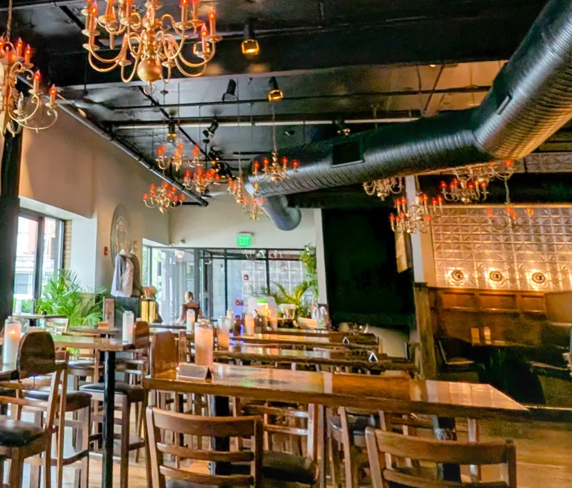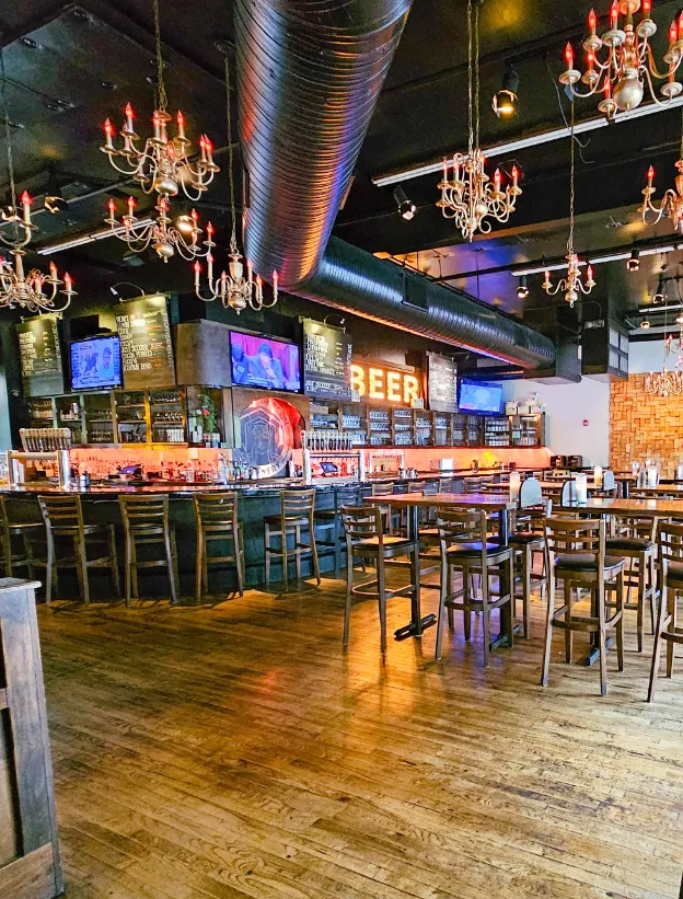 Starting with the main restaurant, this was a must-try for us as it was a recommendation from an acquaintance from one of our prior brewery trips. The main restaurant features a modern, elegant, and industrial mixed decor that you would expect to find in a restaurant in the heart of a central metropolitan area. There are a few areas for larger event-specific dining and a standard dining area with a collection of tables and booth-based seating. The shocker is that the main restaurant itself is actually dog-friendly. It was so strange to walk into such a nice location with a dog and be able to sit down for a nice meal. The main restaurant, with a massive wrap-around bar and detached kitchen setup, makes it possible not only to help separate different dog-loving patrons from everyone else, but also allows them to sit in what would usually be considered a no-dogs-allowed zone.