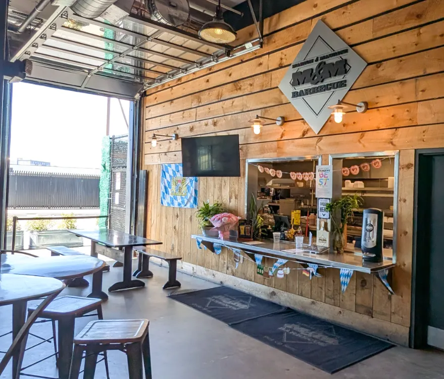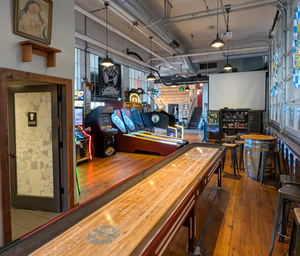 Like other warehouse-style breweries, the brewery is split into two. Most of the facility is dedicated to the actual brewery floor and workspace, all of which is viewable from the customer side through the large industrial windows. On the customer side, there is ample seating on the ground floor, a massive bar right next to the front door, a small, independent barbecue restaurant off to the left, and a large gaming/arcade area just behind the main bar.